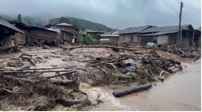 Caused by heavy downpours, the catastrophe surged through Ban Pang Ung and Ban Pang Ung Mai villages in the Mae Suek subdistrict. More than 100 residences were impacted, including eight that were completely destroyed.