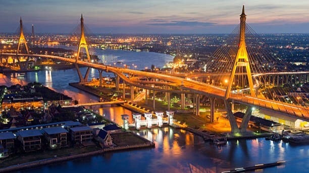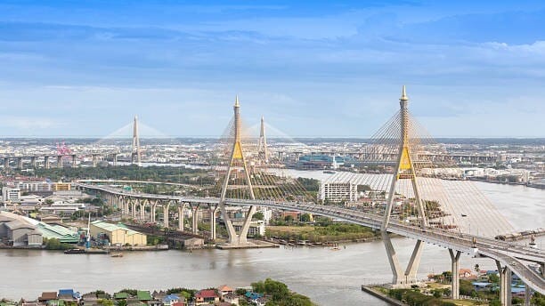 The Bhumibol Bridges, also called the “Mega Bridges,” are two large cable-stayed bridges in Thailand. They connect the busy industrial area of Samut Prakan with the Port of Bangkok. These impressive bridges have diamond-shaped pylons and long spans that let them cross the Chao Phraya River twice. Together with high-level roads called viaducts, the bridges and connecting roads stretch for about 5 kilometers. The Bhumibol Bridges are a key part of the 13-kilometer Industrial Ring Road, which helps connect southern Bangkok with Samut Prakan province.